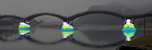 「時空の架け橋」と命名されたプロジェクションマッピングは、木造五連のアーチ橋という建造物の特長を生かして、橋の橋脚部に岩国にゆかりのある映像を映し出されます。
