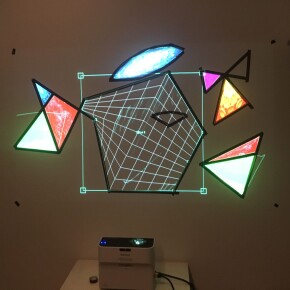 プロジェクションマッピングの概念やマッピングソフト(Resolume Arena7)の基本を学び、チーム毎に投影物のデザインを考え設置する。