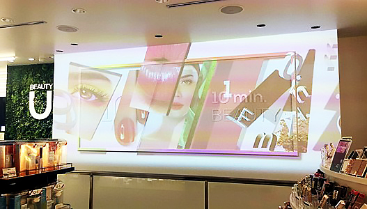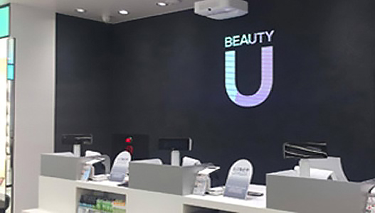 マツモトキヨシの新コンセプトの店舗「beautyU 銀座店」に照明やLEDパネル、音響が全て連動したプロジェクションマッピングで店内を演出。女性が短時間で美しく変わる様を映像で表現。