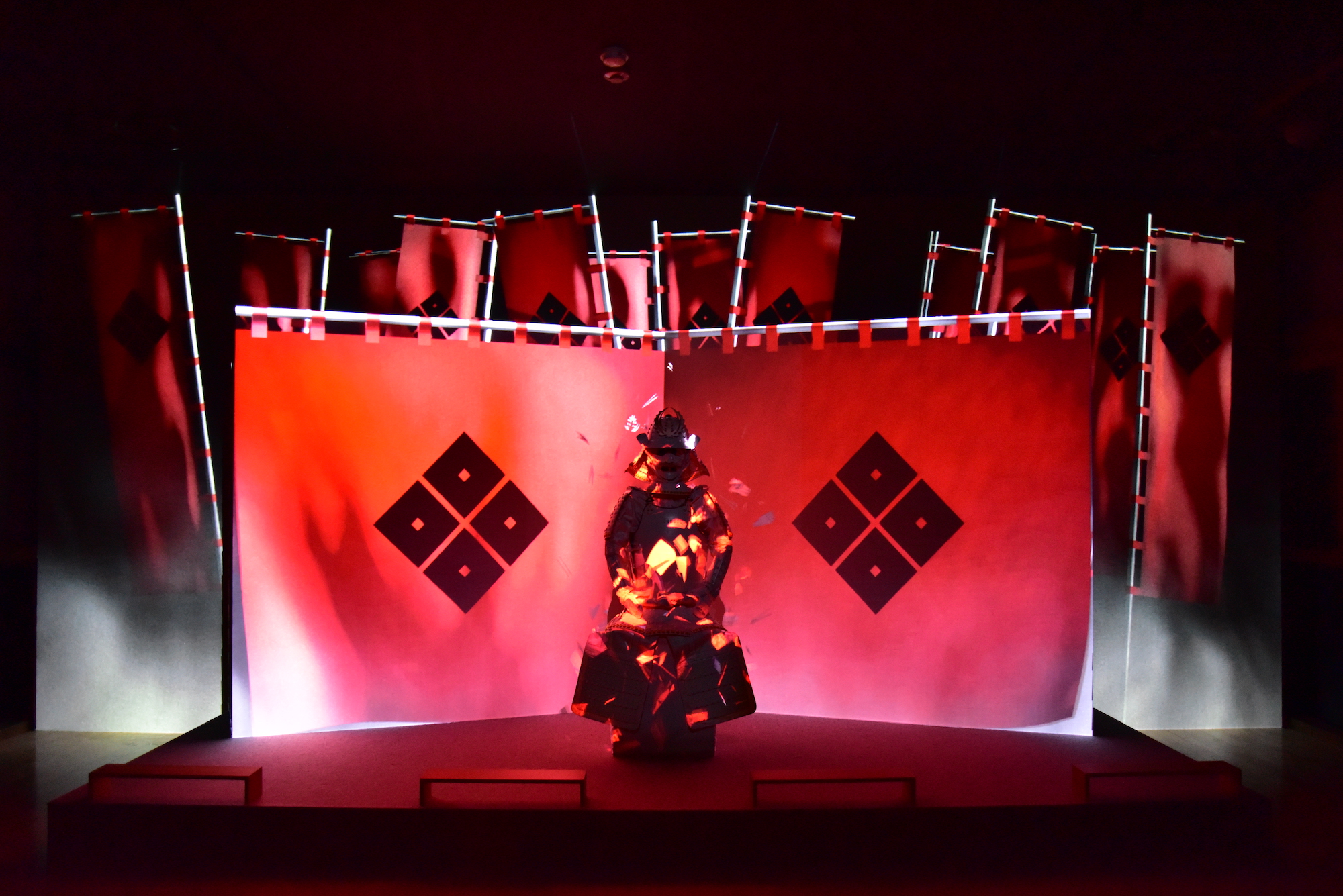 スポット展示された「白い1体の甲冑」が、プロジェクションマッピングで、静から動へ。タイトルは「花伐つ鎧」 – HANA UTSU YOROI- で、武士の哀愁を帯びる亡骸がテーマ。